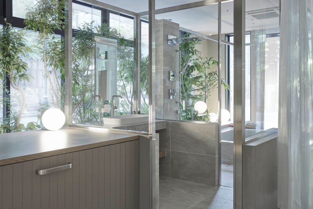 ダークトーンでまとめたバスルームが外の自然光や緑と美しいコントラストを生み出し、空間全体にメリハリを与えます。