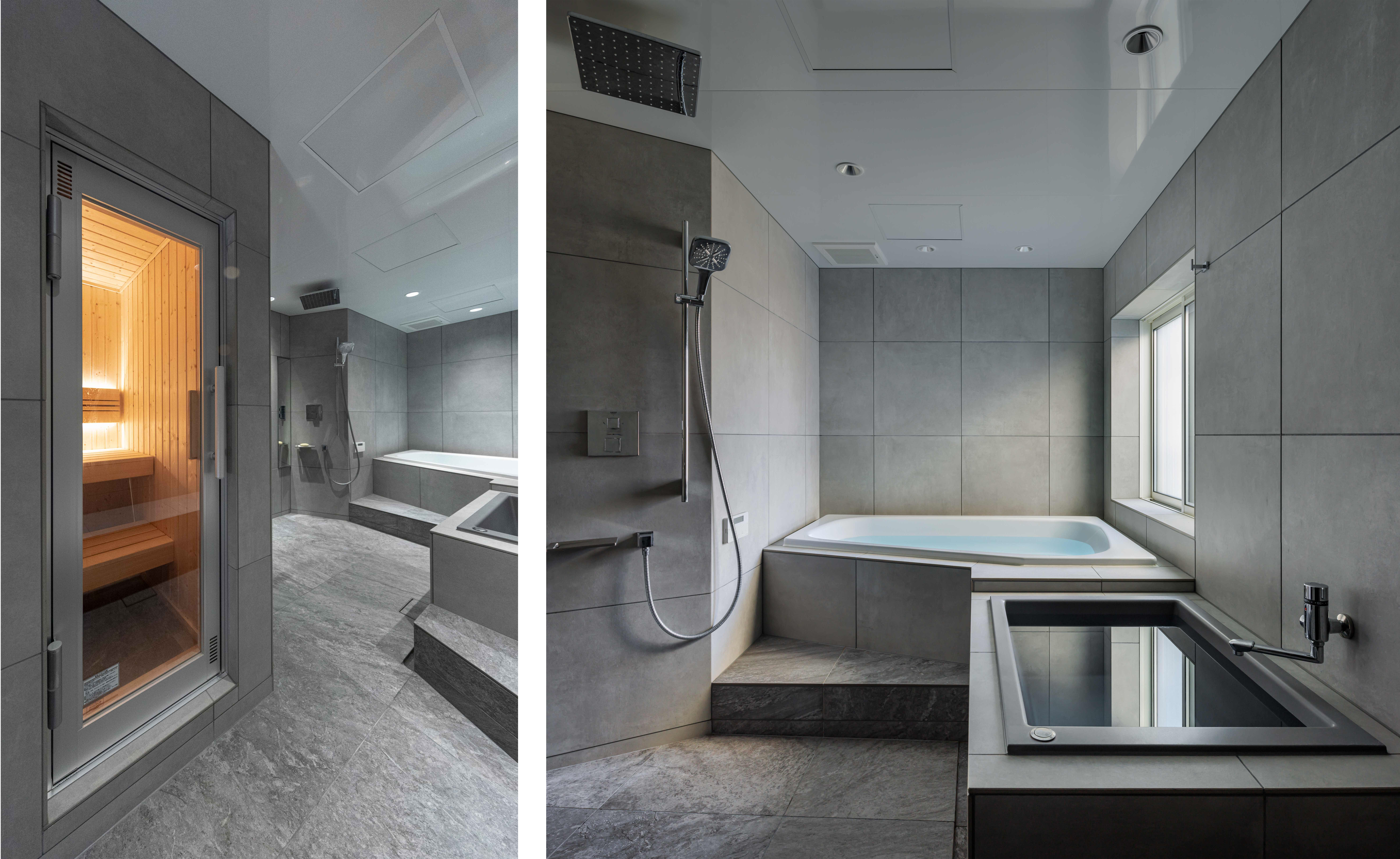 こちらの施工例は、そんな3つをひとつの空間に収めた贅沢なプランです。浴槽が2つ、サウナ、ベンチといろいろな要素をとりいれながらも、浴室全体を落ち着いたトーンで統一しながら、モダンな空間となっております。